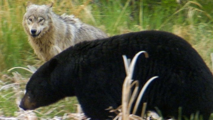Dog versus bear. Bears, including the black variety, are omnivores. This means they will eat just about anything, except your mother-in-law’s roast chicken which looks like great-aunt Edna after her cremation. Although a fully grown wolf is a handful for a black bear, wolf pups are not, and the roguish bears will take a pup when they can. Of course, the wolves have other ideas and will defend their offspring with their lives.