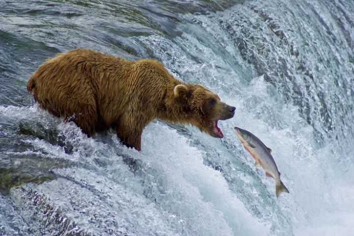 The spectacle of Grizzly bears fishing for salmon in Alaska is one of nature’s great events. Great shaggy beasts gather to watch the plump fish as they fight their way upstream to spawn. The bears try to ignore those shaggy beasts as they focus on catching the salmon, but the camera-clicking can be a real nuisance.